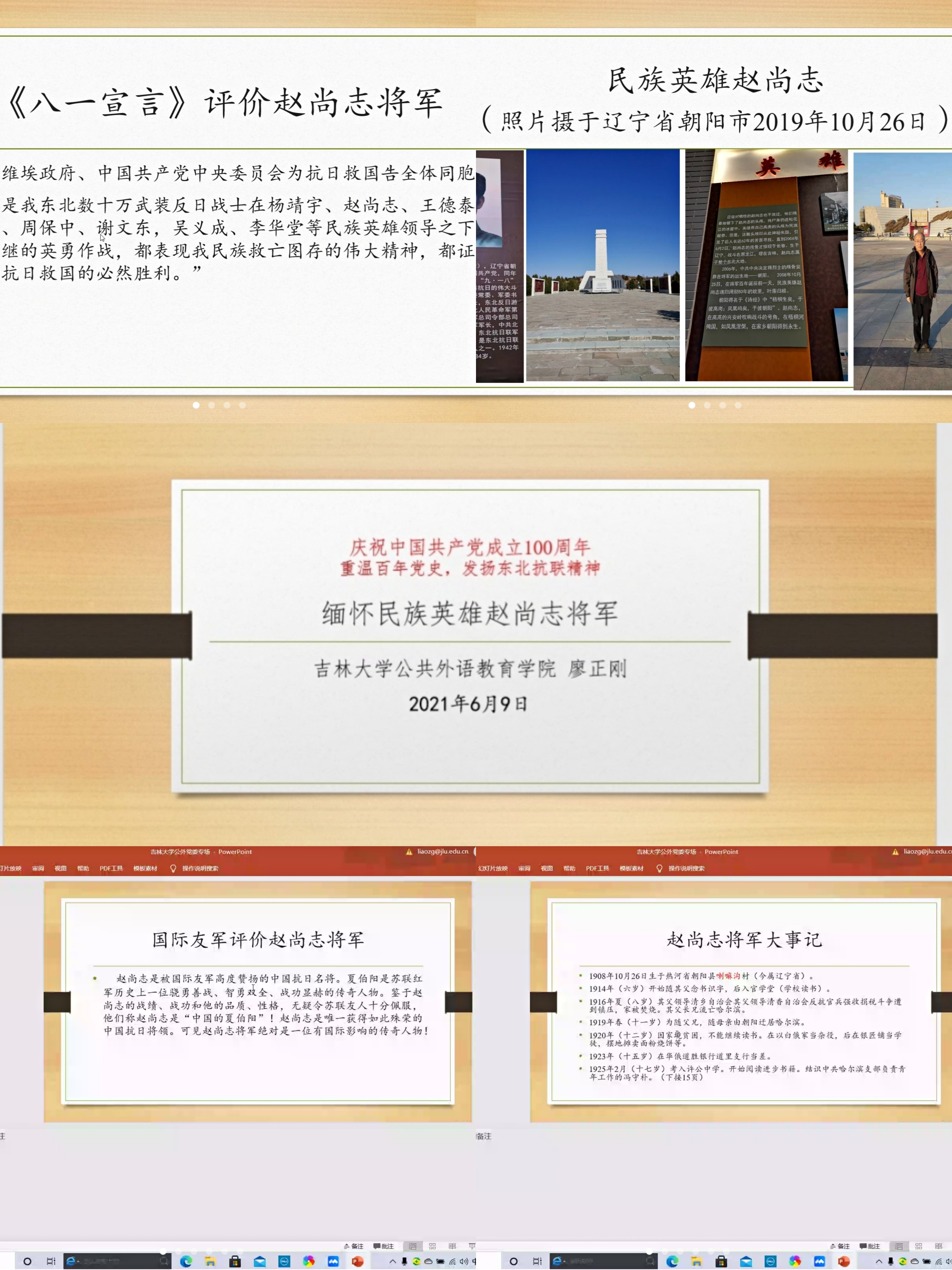 为认真领悟习近平总书记在党史学习教育动员大会上的重要讲话精神,做到学史明理、学史增信、学史崇德、学史力行,以优异成绩迎接建党一百周年,米兰体育平台党委联合教工第七党支部于2021年6月9日晚19时以线上形式召开“缅怀民族英雄赵尚志将军”主题讲座学习活动。主讲人为公共外语教育学院学术委员会委员、公共外语教育学院第七教研室主任、英语语言文学博士、硕士研究生导师廖正刚教授。会议由院党委副书记徐杰主持,学院领导班子成员及各支部党员参加了本次学习。
