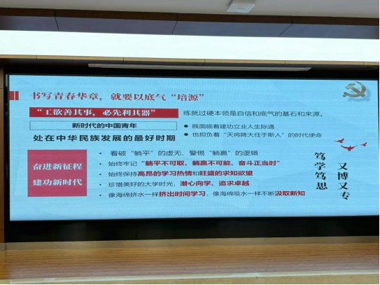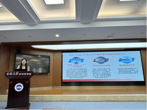 建设教育强国,是以中国式现代化全面推进中华民族伟大复兴的基础工程。李颂婧讲师从建设教育强国的重要性,百年党史的教育发展历程,新时代的青年担当三个方面展开宣讲。一、建设教育强国是在世界坐标系及对比中做强中国优势、补足短板,展示中国教育自信、凝练中国教育特色和推进中国教育现代化的发展模式。建设教育强国,提升教育国际影响力,是我国构建人类命运共同体、高水平扩大对外开放的重要战略路径。二、从百年党史中回顾教育发展历程,无论是新民主主义革命时期、改革开放时期还是党的十八大以来,立德树人的根本任务从未改变,其内涵却不断丰富,中国教育与中国共产党一直在政治思想纲领上同心同行,代又一代教育工作者为中国共产党人的精神谱系源源不断地贡献着教育的智慧和力量。三、对于当代青年,若矢志教育报国,就要以骨气立魂,书写青春华章,就要以底气培源。新时代的中国青年,处在中华民族发展的最好时期,要始终牢记 躺平不可取,躺赢不可能、 奋斗正当时,成为中国式现代化建设的主力军。