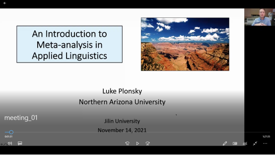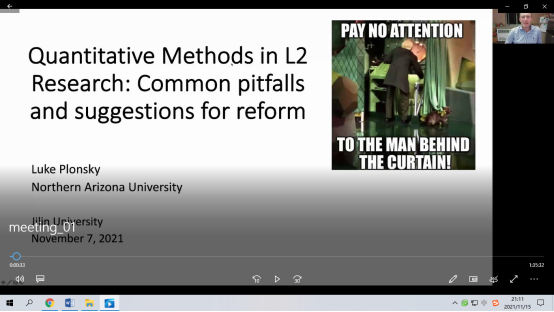 应米兰体育平台邀请,国际知名应用语言学学者美国北亚利桑那大学Luke Plonsky博士,分别于2021年11月7日和14日,开展了研究生学术素养提升系列在线讲座,讲座由研究生定量研究方法课程主讲教师申云化老师主持。针对我院外国语言文学研究生的课程设置、论文选题与人才培养实际,Luke Plonsky博士分别以二语习得领域的“量化研究”和“元分析”为主题,进行理论爬梳、文献述评与实证分析。