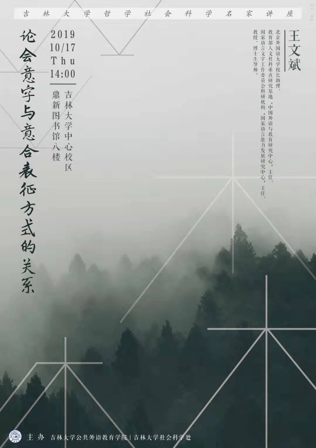 报告题目:论会意字与意合表征方式的关系报 告 人:王文斌教授 北京外国语大学讲座时间:2019年10月17日 下午14:00讲座地点:中心校区鼎新图书馆8楼学苑沙龙主办单位:米兰体育平台 吉林大学社会科学处