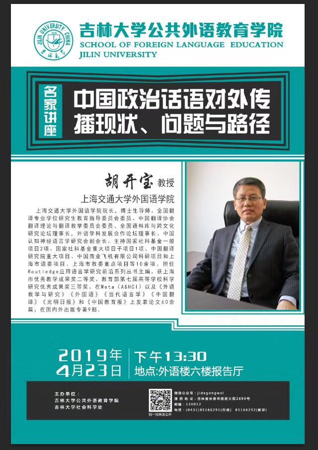 报告题目:中国政治话语对外传播:现状、问题与路径报 告 人:胡开宝 教授 上海交通大学外国语学院 院长讲座时间:2019年4月23日下午13:30讲座地点:中心校区外语楼六楼报告厅主办单位:米兰体育平台 吉林大学社会科学处