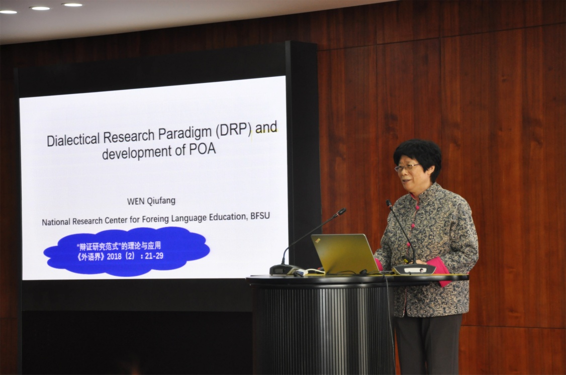 文秋芳教授做题为“Dialectical Research Paradigm(DRP)and Development of POA”的主题报告。POA(Production-Oriented Approach),即产出导向法,是文秋芳教授带领其团队历经近10年研究提出的具有中国特色的外语教育理论。文教授首先阐述了传统研究方法不适用于产出导向法的研究目标的原因,详述了辩证研究法的哲学理念,研究流程及数据分析方法,提出了为达成研究目标,进行“理论建设-实践改进-意义阐述”为循环体的辩证性研究方法,最终达到使产出导向法在理论和实践上的双优化,使其日臻成熟,逐渐完善。文教授的报告现场反响强烈,针对师生提出的问题,文教授给予理论指导和具体操作建议,提问师生及现场观众都受益匪浅,收获颇丰。