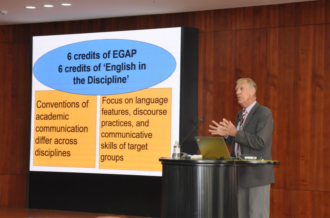 Ken Hyland教授做题为“Specificity, writing, and EAP teaching”的主题报告。Hyland教授就中国的研究者最为关注的有关学术英语写作的主题做了详细而生动的阐述。报告首先阐释了学术英语的整体写作风格,并根据人文科学和自然科学的差别分析学术英语写作特点。随后,围绕各个学科独特之处分别展示其写作中语言的不同,同时给出范例,使在座的老师和同学更为直观地体验不同体裁的写作特点。另外,Hyland教授介绍了香港大学为提高学生写作能力所设置的核心英语课程,以及学生如何利用课上课下结合互动的方式来完成中学日常写作到大学的学术写作的提升,对教学的实践和研究都有实际指导意义。Hyland教授的报告使在场观众无论在自身学术写作的提升和写作教学实践研究都受益匪浅,深受鼓舞。