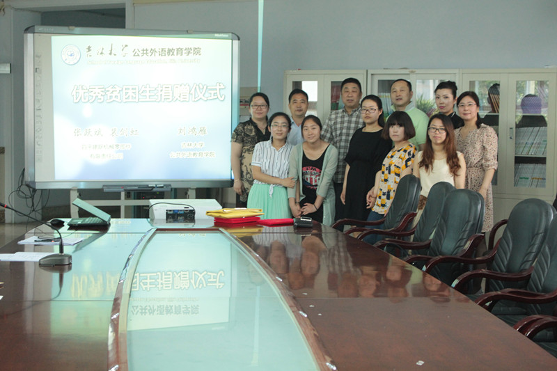 2015年5月26日上午10:00,公共外语教育学院优秀贫困生捐赠仪式在吉林大学外语楼六楼会议室举行。出席本次仪式的有四平建跃机械零部件有限责任公司总经理张跃斌先生、裴剑虹女士、公共外语教育学院的刘鸿雁老师、公共外语教育学院党委书记郝贺、行政副院长周晓宇、教科研办公室李欣霜及五名受资助贫困生。会议由郝贺书记主持。