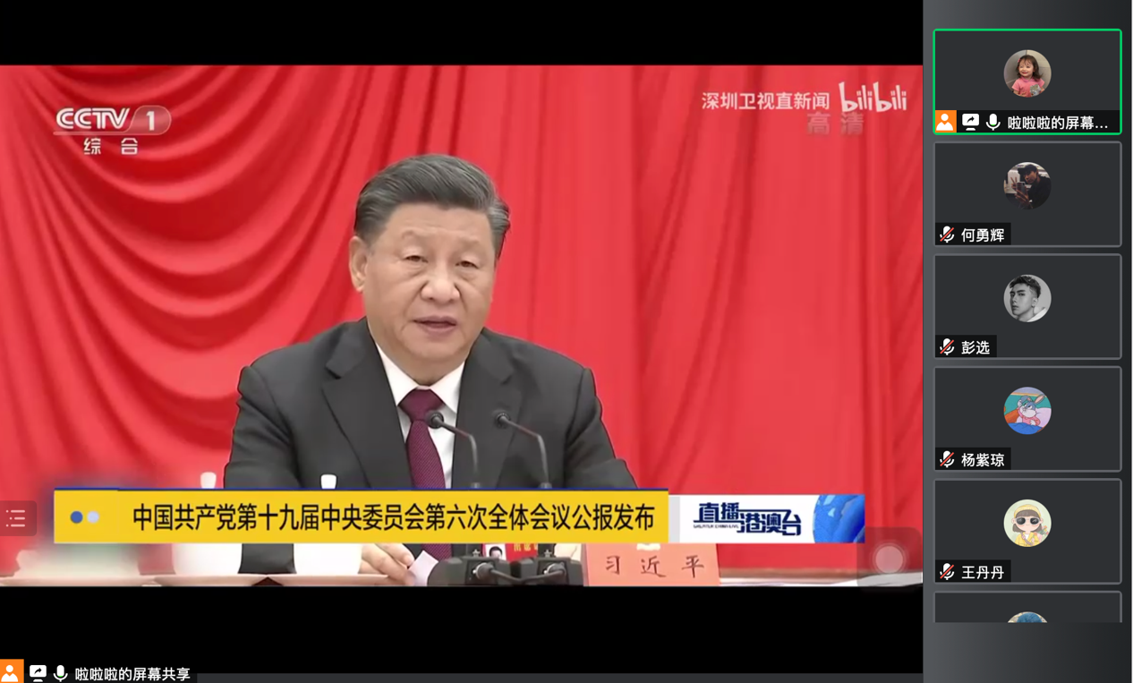 曲哲同学带领大家从“中共中央全体会议的含义”、“十九届六中全会的两个特点”以及“十九届六中全会的成果”以及“十九届六中全会的意义”等方面深刻学习了十九届六中全会的精神。党的十九届六中全会是在重要历史关头召开的一次具有重大历史意义的会议,全会最重要的成果是审议通过了《中共中央关于党的百年奋斗重大成就和历史经验的决议》。全会通过的《决议》共七个部分,在内容摆布上有两个特点:第一个特点是这次主要总结党的百年奋斗重大成就和历史经验,第二个特点是突出中国特色社会主义新时代这个重点,用较大篇幅总结党的十八大以来的原创性思想、变革性实践、突破性进展和标志性成果。曲哲同学号召大家认真领悟十九届六中全会精神,并将其与研会的日常工作相结合,更好地为同学们服务。