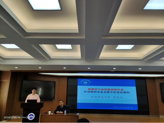 为深入贯彻落实习近平总书记对研究生教育工作的重要指示和全国研究生教育工作大会会议精神,学习习近平总书记回信勉励全国高校黄大年式教师团队代表的有关精神,深化研究生培养质量,进一步提高研究生导师队伍与素质,公共外语教育学院协同研究生院于2021年12月15日,邀请东北师范大学外国语学院博士研究生导师张绍杰教授做题为“教师学习者和教师研究者:外语教师专业发展中的身份建构”的学术报告。学术报告由副院长姜峰教授主持,院长潘海英教授、研究生导师及博士、硕士研究生参会。