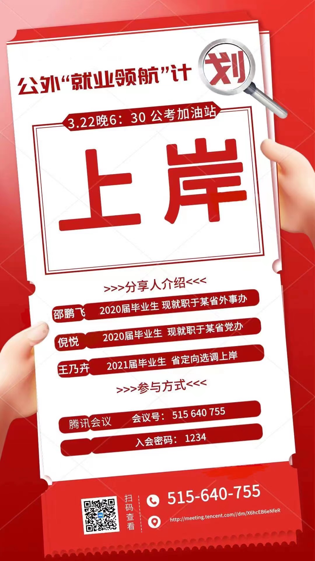 为进一步开展就业指导工作,全力推进我院同学高质量就业,公共外语教育学院于2022年03月22日通过腾讯会议线上举办“就业领航”计划——公务员方向专场分享会,帮助同学们了解公务员和选调生,提前做好职业规划。本次分享会邀请了已成功考取公务员和选调生的2020届、2021届毕业生代表,围绕个人备考的心路历程与经验总结展开分享。会议由学院研究生辅导员曾媛主持,2020级和2021级百余名同学参会,进行了广泛交流,气氛热烈。