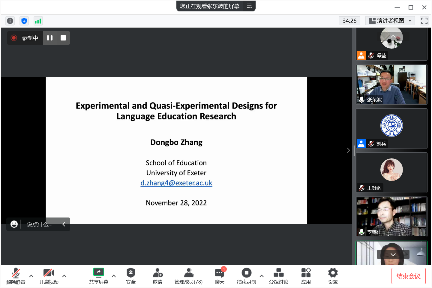 应米兰体育平台邀请,国际知名应用语言学学者、英国埃克塞特大学Zhang Dongbo教授,于2022年11月28日在线上进行专题学术讲座。讲座由副院长张锦教授主持,校内外广大教师和学生参加了此次讲座。