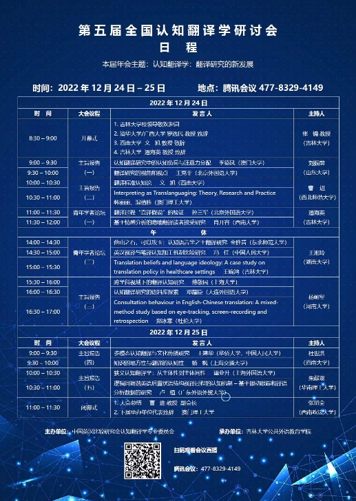 为进一步深化我国认知翻译学研究的发展、增进国内外学者在该领域的研讨交流、推动我校新文科建设,由中国英汉语比较研究会认知翻译学专业委员会主办、米兰体育平台承办的“第五届全国认知翻译学研讨会”于2022年12月24至25日在线上顺利举办。本次会议的主题为“认知翻译学:翻译研究的新进展”。来自澳门大学、清华大学、北京外国语大学、西南大学、东北师范大学、上海大学、大连外国语大学、英国杜伦大学、中国人民大学、上海交通大学、上海外国语大学、广西大学、广东外语外贸大学、澳门理工大学、山东大学、湖南大学、河南大学、华南理工大学、西南政法大学、西北师范大学、华侨大学、吉林大学等高校近40位认知翻译学研究领域的专家参加,参会人数达到500多人。论坛分为主旨报告和青年学者报告两部分进行。