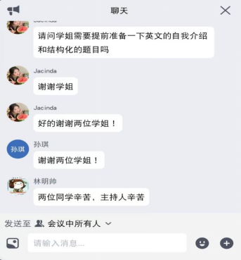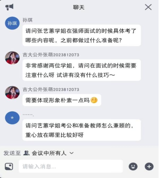 在答疑互动环节张艺蕙和卢知慧就同学们提出的疑问进行了耐心细致的解答,并激励同学们明确就业方向,灵活应对求职过程中的挑战。